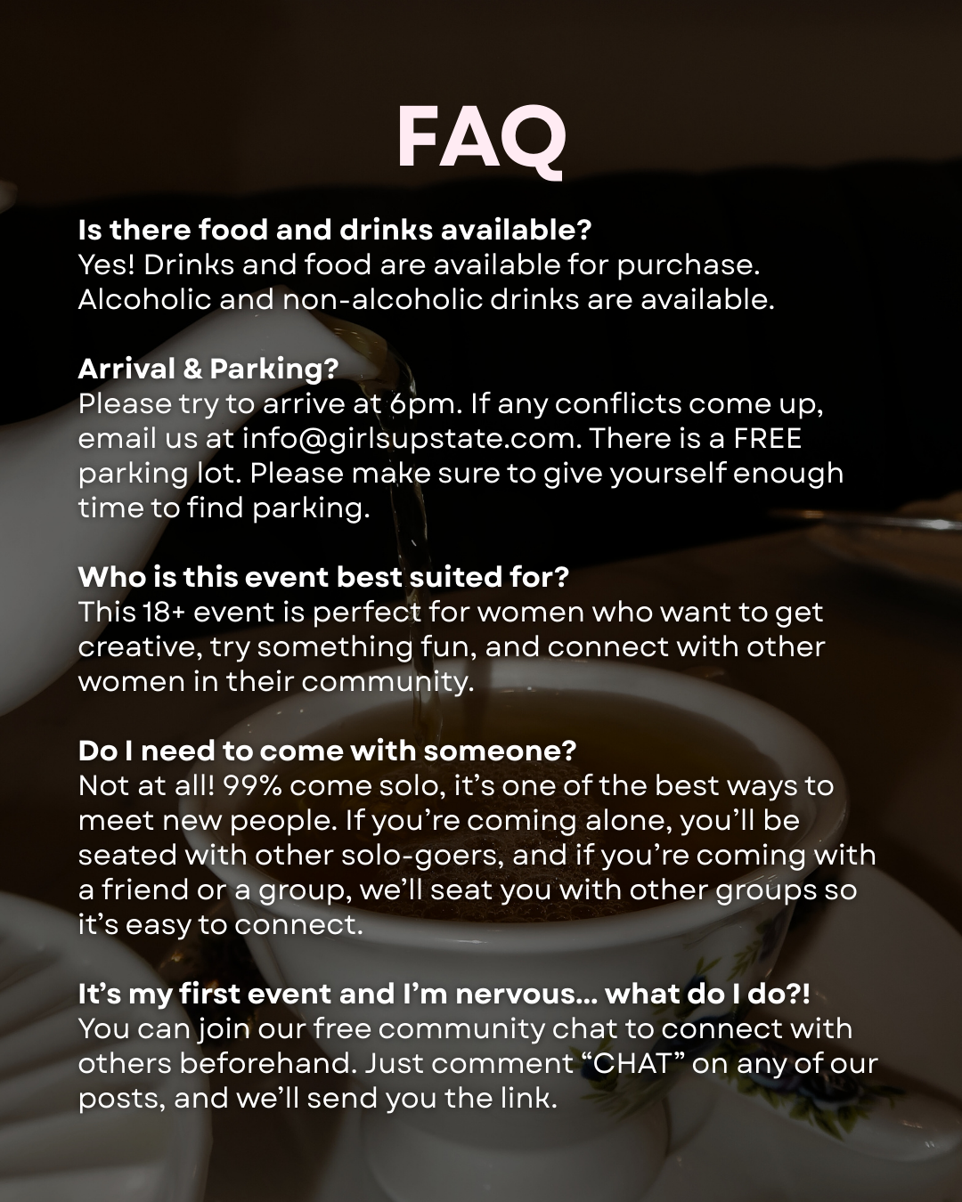We have a no return policy, unless Girls Upstate is responsible for a cancellation or reschedule of the event/workshop etc.